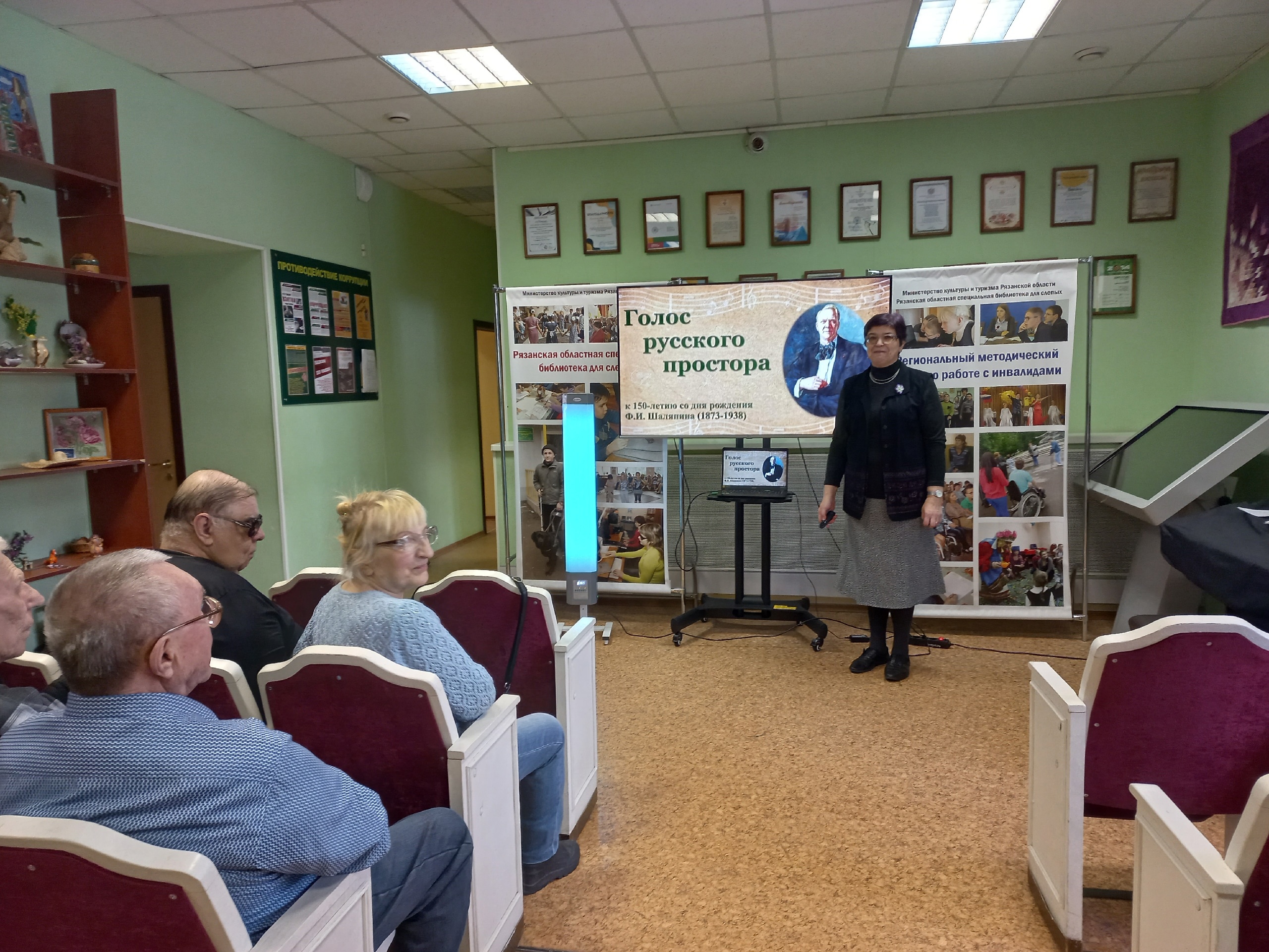 «Голос русского простора» – под таким названием прошёл 14 февраля 2023 года вечер-портрет, посвящённый 150-летию со дня рождения Ф.И. Шаляпина. Главный библиотекарь Регионального методического центра по работе с инвалидами Смирнова О.А. рассказала о жизни знаменитого певца, его творческом становлении, людях, помогавших ему стать великим оперным артистом и бывших его друзьями.