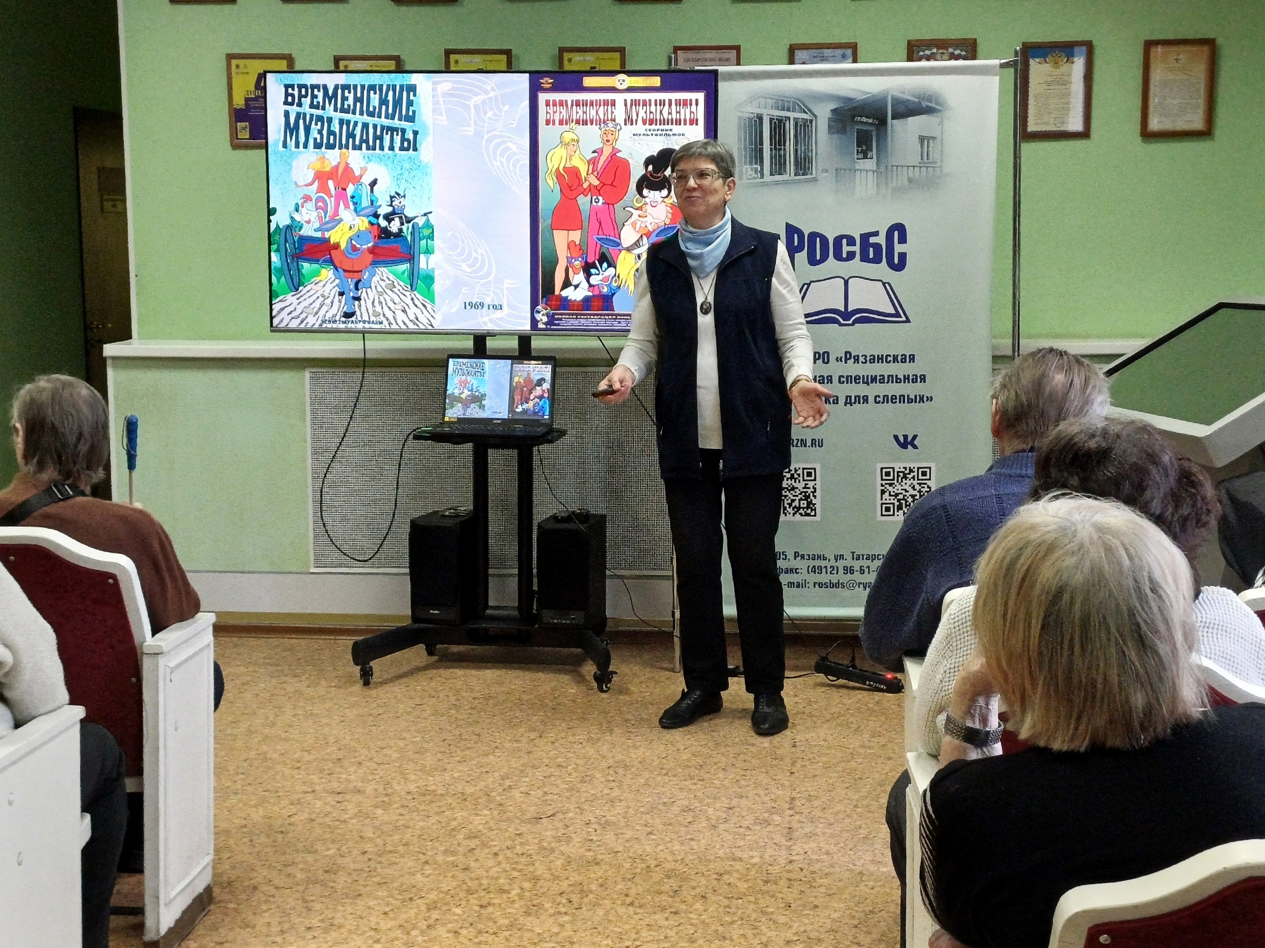 Главный библиотекарь Регионального методического центра по работе с инвалидами Смирнова О.А. познакомила читателя с биографией Гладкова, рассказала историю создания музыки к самым любимым зрителями фильмам: «Бременские музыканты», «Точка, точка, запятая», «12 стульев», «Обыкновенное чудо», «Сватовство гусара».