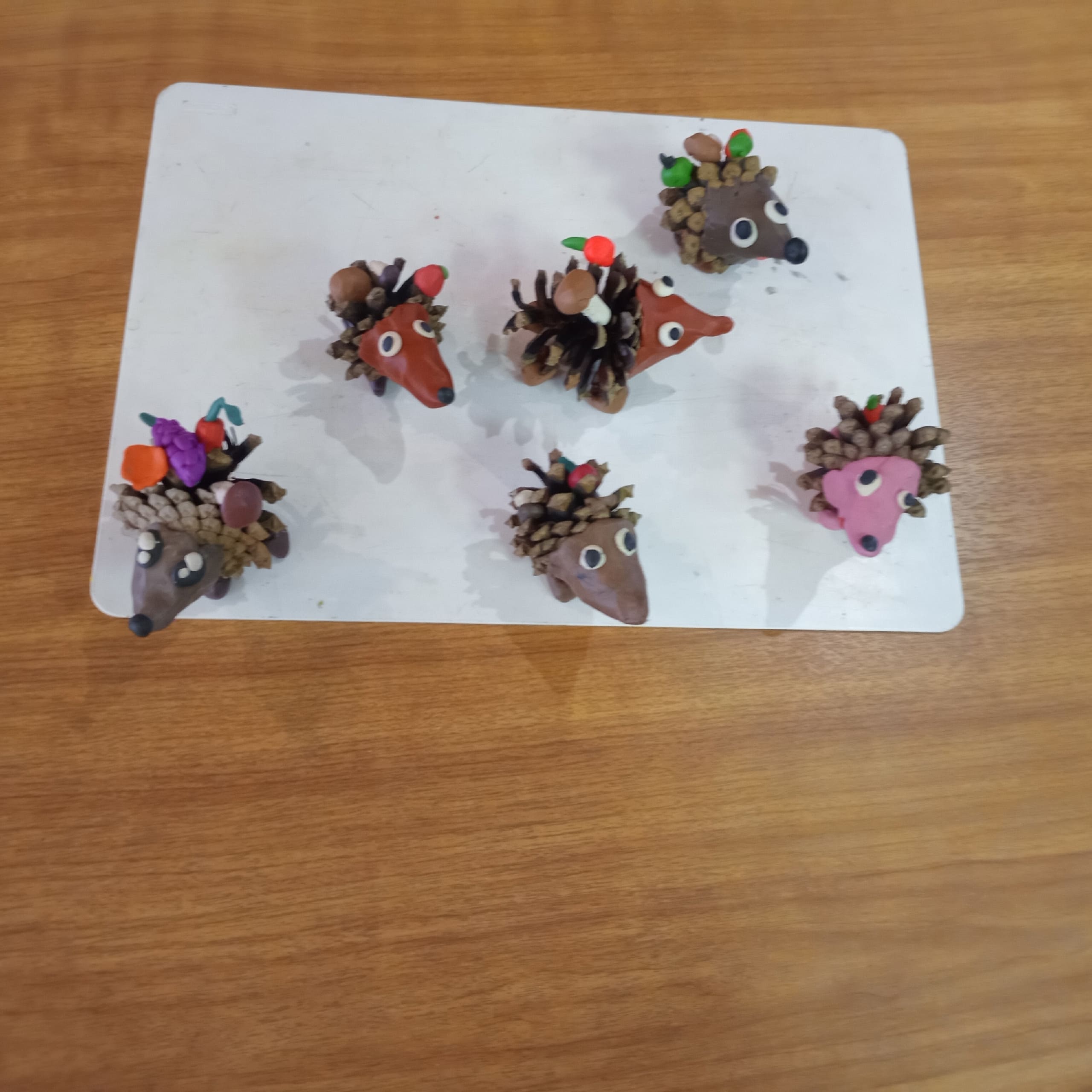 На занятии дети услышали стихи и рассказы о ежах, рассказали о своих встречах с этими милыми зверьками, а потом научились делать симпатичных ёжиков из шишек и пластилина. У нас получилась целая семейка ёжиков, несущих на колючках разные припасы для зимовки.