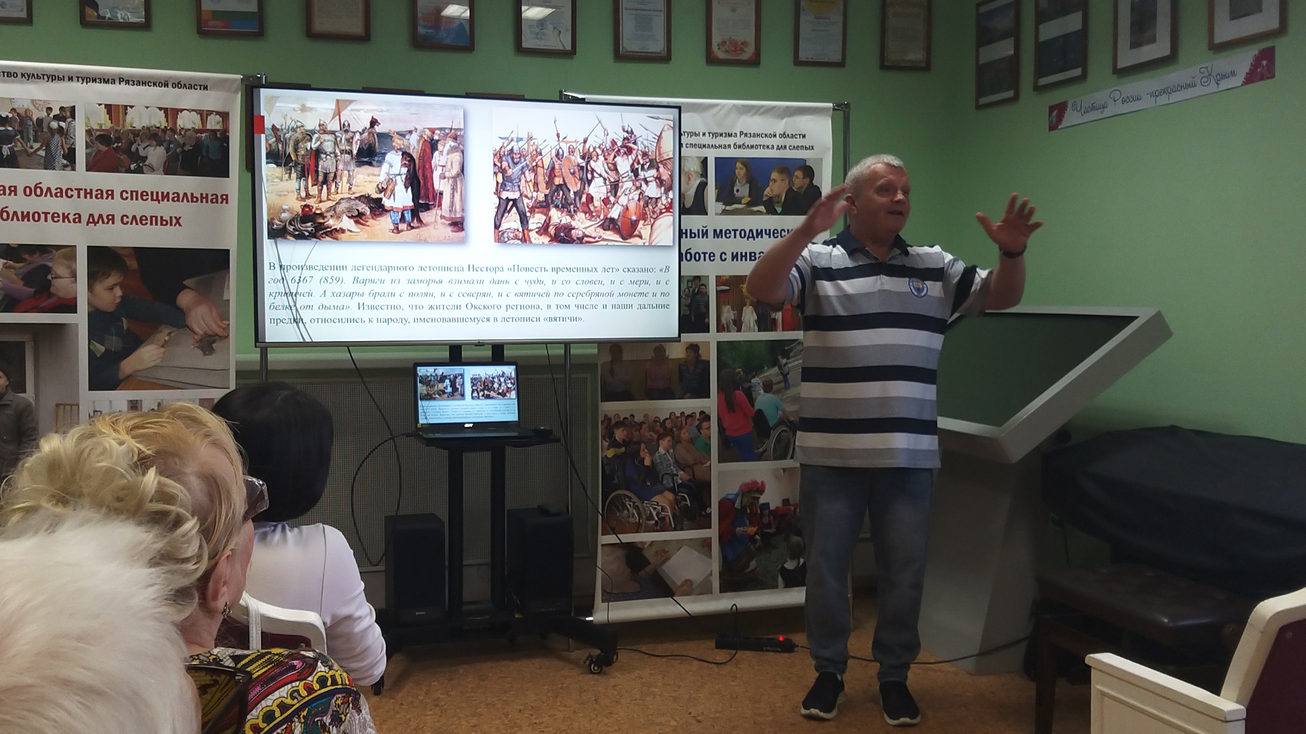 25 апреля 2023 года в Рязанской областной специальной библиотеке для слепых с лекцией «Город князя Ярослава» выступил главный методист Рязанского музея путешественников П.А. Завишо.