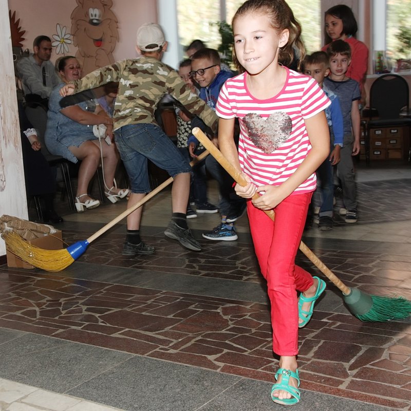 После этого Василиса Премудрая загадала детям загадки о сказочных героях и предложила отправиться в путешествие по сказкам, чтобы найти семь ключей от замков, на которые заперт волшебный сундук. Ребята с удовольствием играли в различные подвижные игры с Емелей, Иваном Царевичем и Бабой-Ягой, получили ключи и открыли сундук с подарками, которым были очень рады. А на дне сундука дети нашли волшебный звонок, чтобы открыть новый учебный год. Не обошлось без чествования первоклассницы Али Ильиной, которая показала всем, как ловко она умеет собирать портфель. Потом ребята читали стихи и играли на фортепьяно.