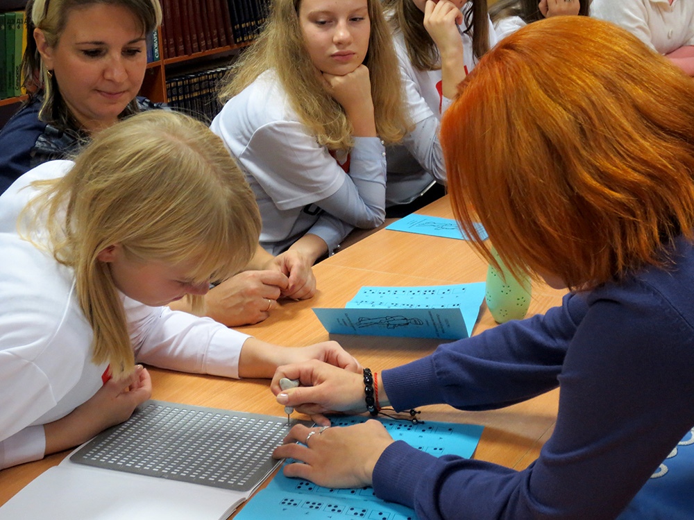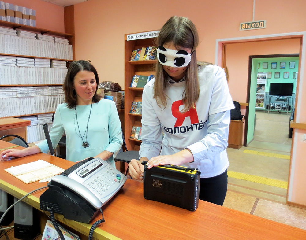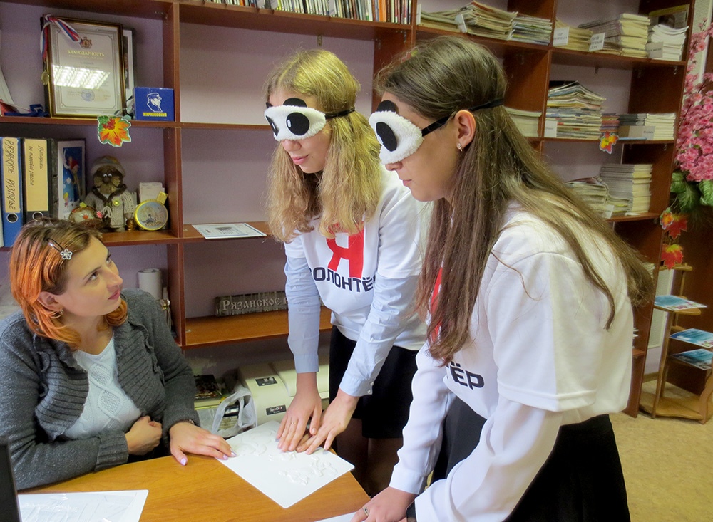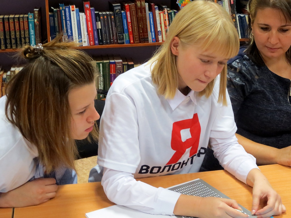 Для волонтеров из средней общеобразовательной школы №73 специалисты библиотеки организовали интерактивную площадку «Мир на ощупь», для того чтобы участники смогли понять, как ощущает мир человек с ограничениями здоровья по зрению: ходили с помощью белой трости по библиотеке, пользовались тифлофлешплеером, узнавали, как незрячий человек работает на компьютере и с мобильным устройством, угадывали ароматы, работали с рельефно-графическими картинками, с помощью грифеля и специального прибора учились писать шрифтом Брайля.
