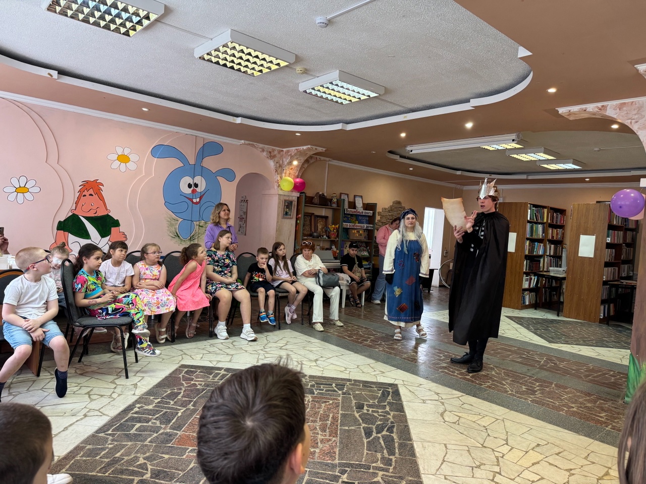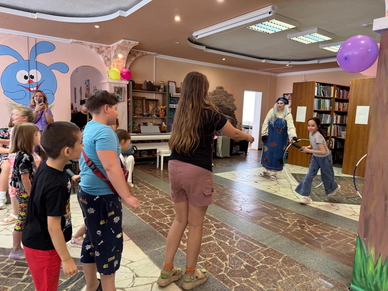 Заведующая детским отделом Валентина Петровна Гусева поздравила детей и их родителей с началом летних каникул, потом ребята встретились с Кащеем, Бабой Ягой, Петрушкой и Летом. Они отгадывали загадки, делали зарядку, участвовали в весёлых конкурсах и эстафетах, пели, танцевали и играли в подвижные игры.