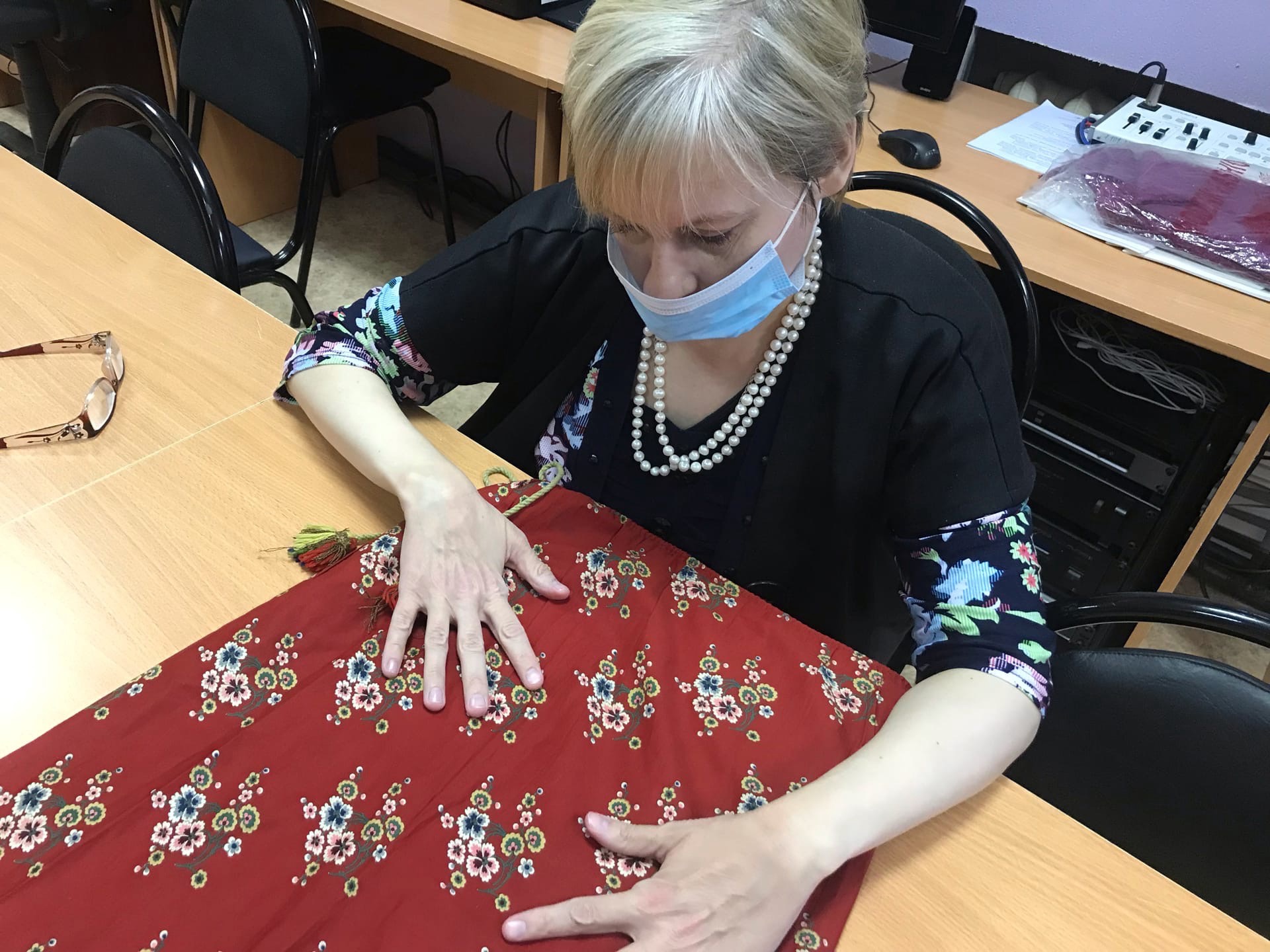 В процессе мероприятия незрячим читателям выдалась возможность «вживую» ознакомиться с деталями ряжского костюма: ощутить ткань, из которой сшиты рубаха, понёва и передник, примерить головной убор.
