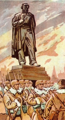 В первые дни войны появился плакат художника П.П. Соколова-Скаля. На фоне памятника А.С. Пушкину изображены солдаты Красной армии, а ниже стихотворные строки (кстати, такое же изображение было на новогодней открытке военных лет):