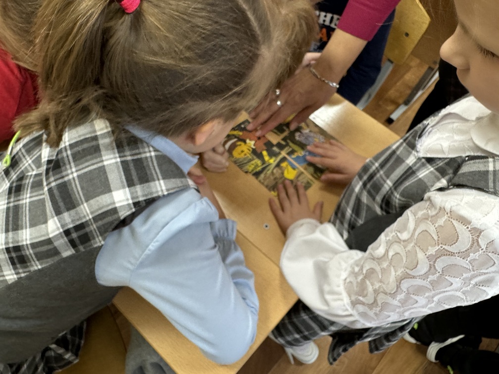 Первоклассники отгадывали загадки, играли в дидактическую игру «Чьи это слова?», собирали пазлы, угадывали мелодии из известных мультфильмов, играли в игру «Волшебный мешочек», исправляли ошибки в названиях сказок и отвечали на вопросы по сказке К. И. Чуковского «Мойдодыр». Викторина прошла весело и интересно.