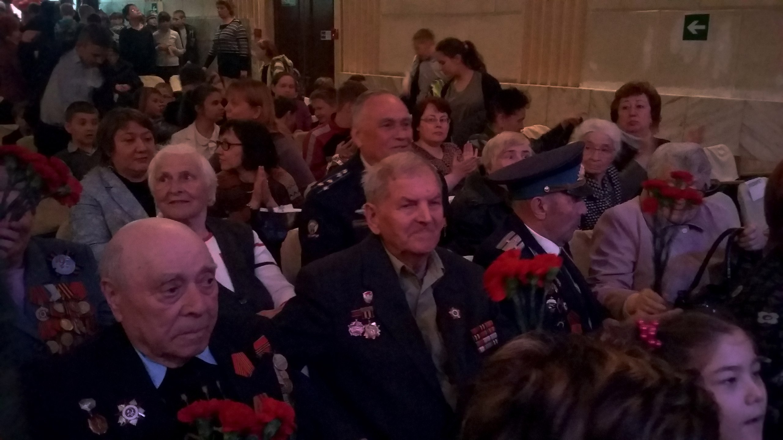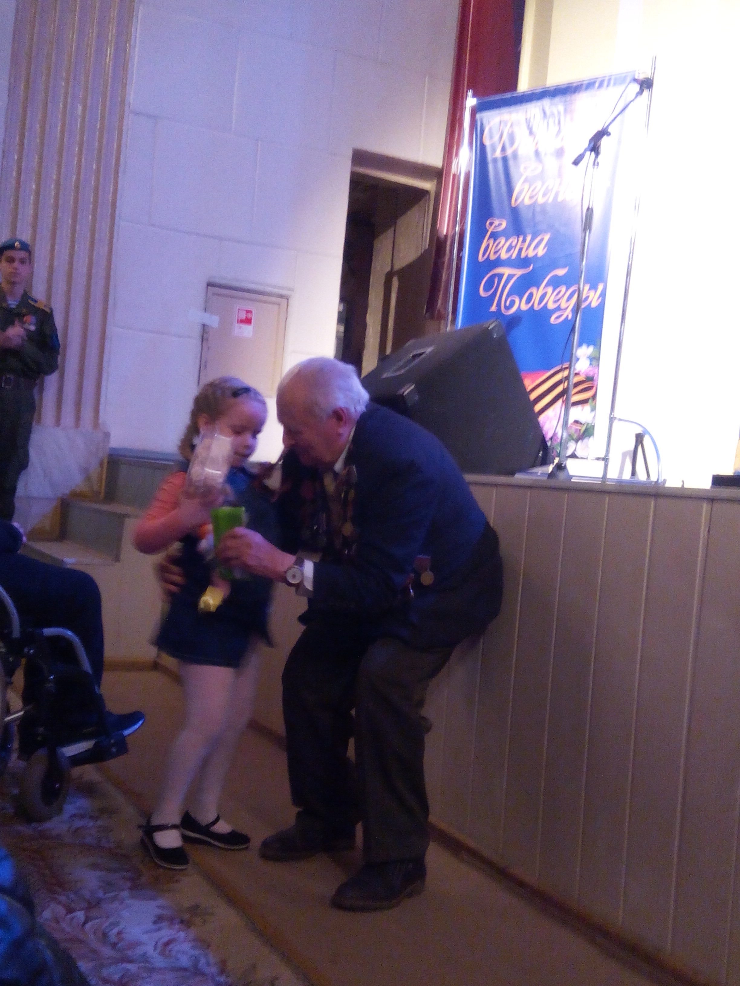 В завершении программы на сцену поднялись ветераны Великой Отечественной войны Дмитрий Алексеевич Черничкин и Татьяна Николаевна Лемешева, которые поблагодарили юных артистов и рассказали о своей боевой юности. Всем ветеранам в зале были вручены цветы.