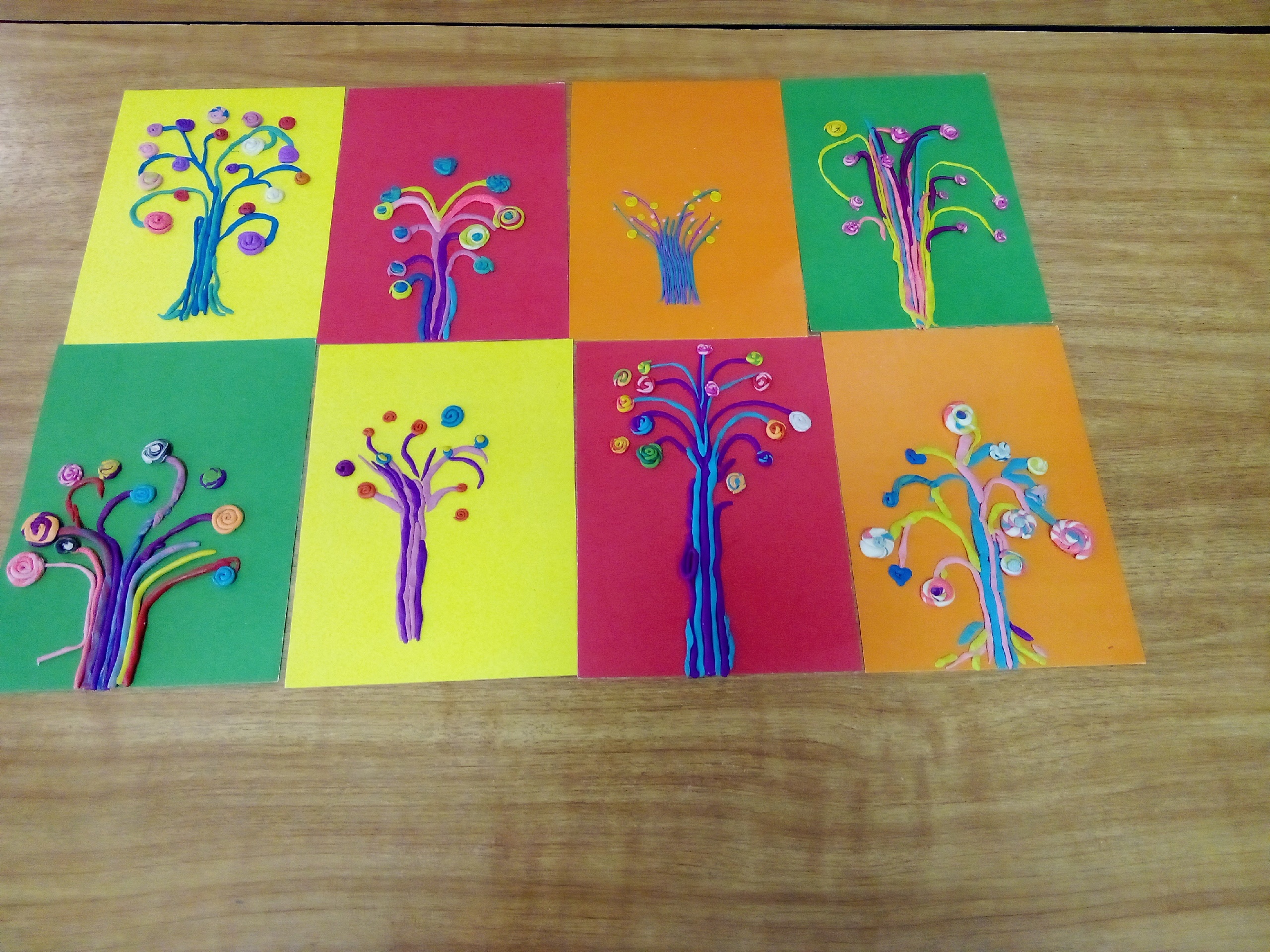 Дети отгадали несколько загадок о деревьях, порассуждали о том, чем полезны деревья в любое время года, а потом приступили к изображению деревьев в технике пластилинографии. На листах бумаги выросли чудесные деревья из тонких пластилиновых полос. Ребятам очень нравится делать что-нибудь вместе, поэтому они с удовольствием приходят на занятия кружков «Умелые ручки» и «Песочная радость». Время за полезной творческой работой пролетает незаметно.