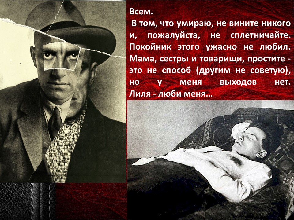 В 1930 году он оказался в ужасном душевном состоянии: равнодушие Лили, несостоявшаяся женитьба на Татьяне Яковлевой, невозможность увидится с дочерью от Элли Джонс, пренебрежение его творчеством партийной верхушки страны, нападки со стороны коллег, плохое физическое состояние, неопределённость отношений с Вероникой Полонской, депрессии – всё это привело поэта к трагической развязке. Брики были за границей. В трудную минуту он оказался один и некому было его остановить и успокоить...как крик души звучат слова из предсмертной записки: «Лиля, люби меня».