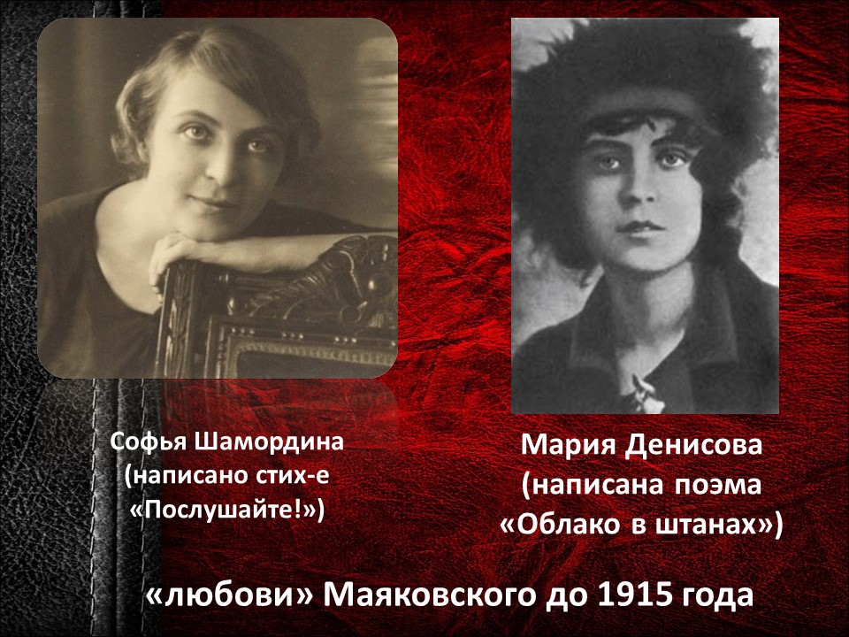 Он влюблялся часто и очень сильно, буквально «беря в плен» возлюбленную. Всю свою страсть он выплёскивал на бумаге. Софье Шамординой он впервые читал стихотворение «Послушайте!», Марии Денисовой посвятил поэму «Облако в штанах» (которую потом посвятил Лиле Брик).