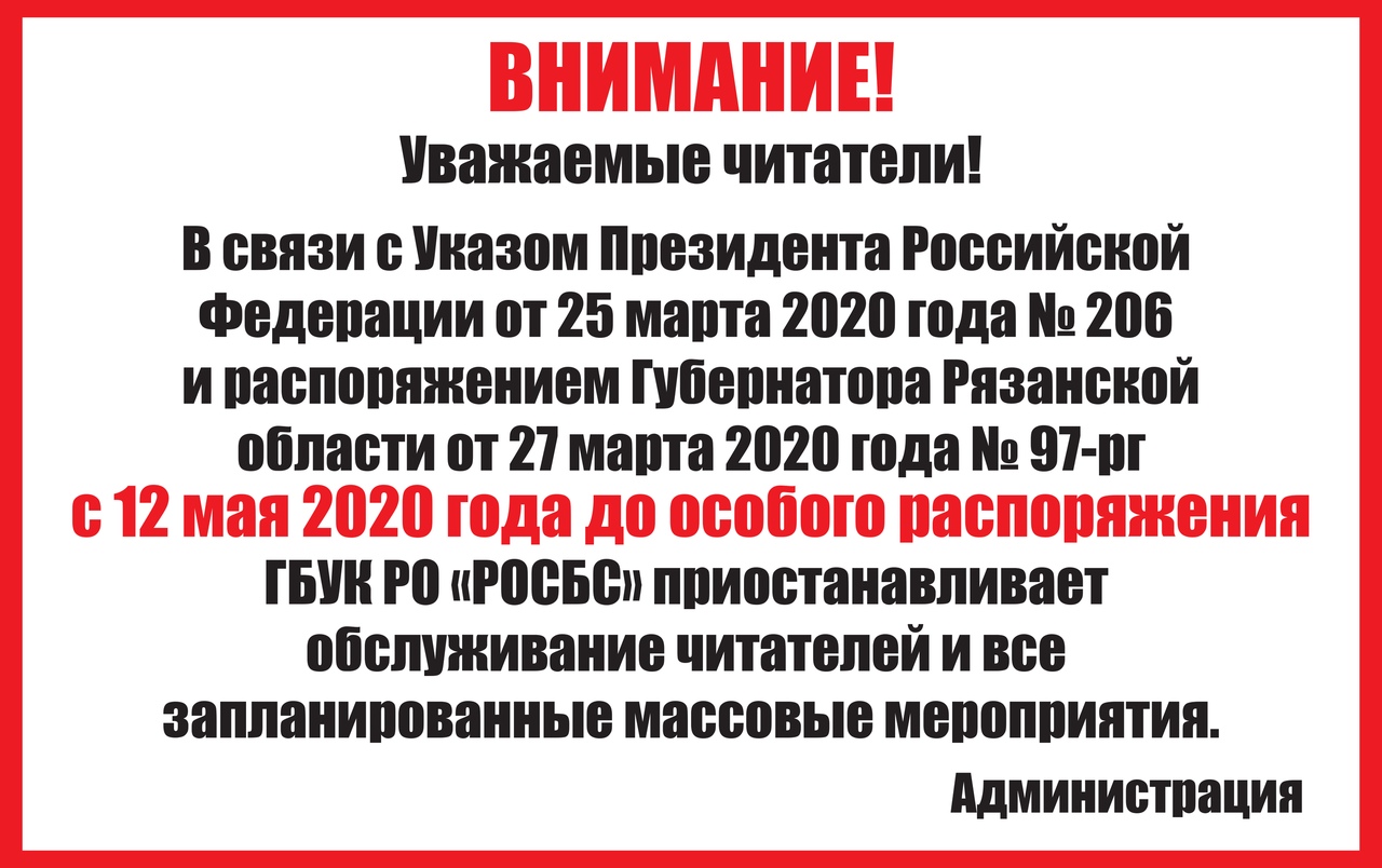 Приостанавливает обслуживание читателей и все запланированные массовые мероприятия до особого распоряжения