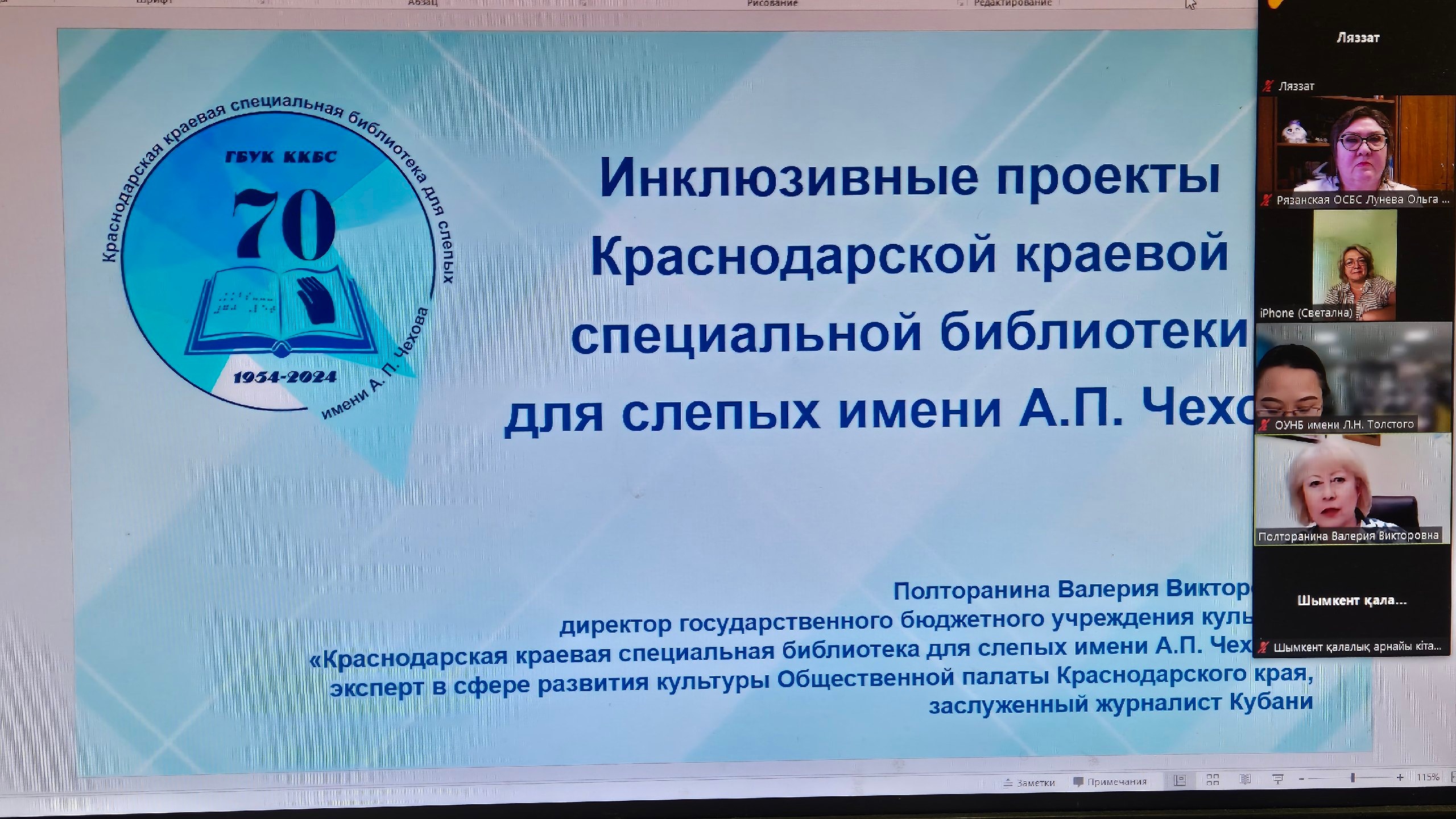 В коференции приняли участие коллеги из Краснодара, Владимира, Челябинска, Калининграда, и, конечно же, из КГУ «Шымкентская городская специальная библиотека для незрячих и слабовидящих граждан» г. Шымкент, Республика Казахстан, КГУ «Костанайская областная универсальная научная библиотека имени Л.Н. Толстого», КГУ «Спецбиблиотека для незрячих и слабовидящих граждан», г. Семей, Республика Казахстан и библиотека № 13, филиал, г. Рудный Костанайской области.