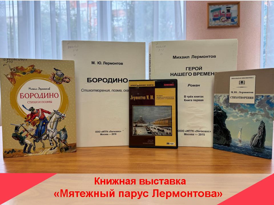С 01.10.2024 по 17.10.2024 в детском отделе Рязанской областной специальной библиотеки для слепых будет экспонироваться книжная выставка «Мятежный парус Лермонтова», посвящённая 210-летию со дня рождения М. Ю. Лермонтова. На выставке будут представлены произведения великого русского писателя, изданные на различных носителях (ртш, плоскопечатные, крупношрифтовые, компакт-диски и флеш-карты).