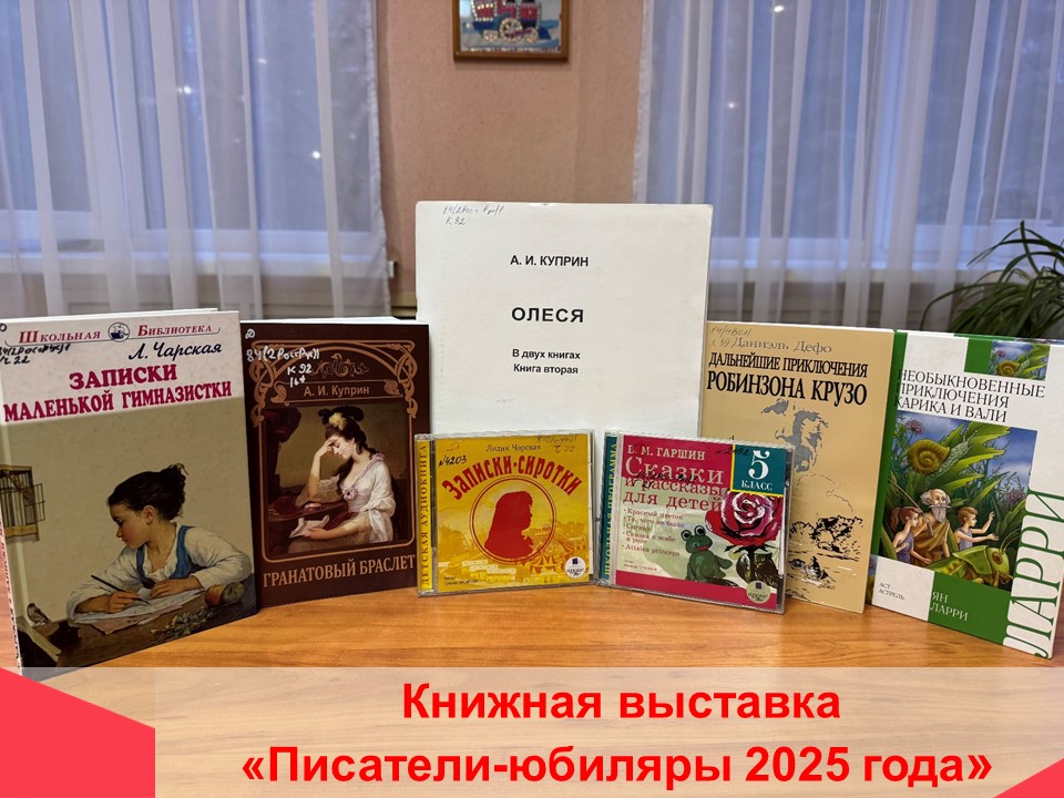 На данной книжной экспозиции будут представлены произведения писателей-юбиляров В. М. Гаршина, Я. Ларри, Л. А. Чарской, Д. Дефо, А. И. Куприна, А. Т. Твардовского, Л А. Кассиля, вошедшие в золотой фонд литературы для детей и подростков. Некоторых из них мы знаем, в основном, по одной из написанных книг, но разве возможно представить себе детское чтение без «Робинзона Крузо» Даниэля Дефо или «Приключений Карика и Вали» Яна Ларри?!