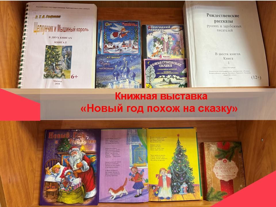 С 16 по 28 декабря в детском отделе Рязанской областной специальной библиотеки для слепых будет экспонироваться книжная выставка «Новый год похож на сказку». Ребята, посетившие выставку, познакомятся с замечательными повестями и рассказами: