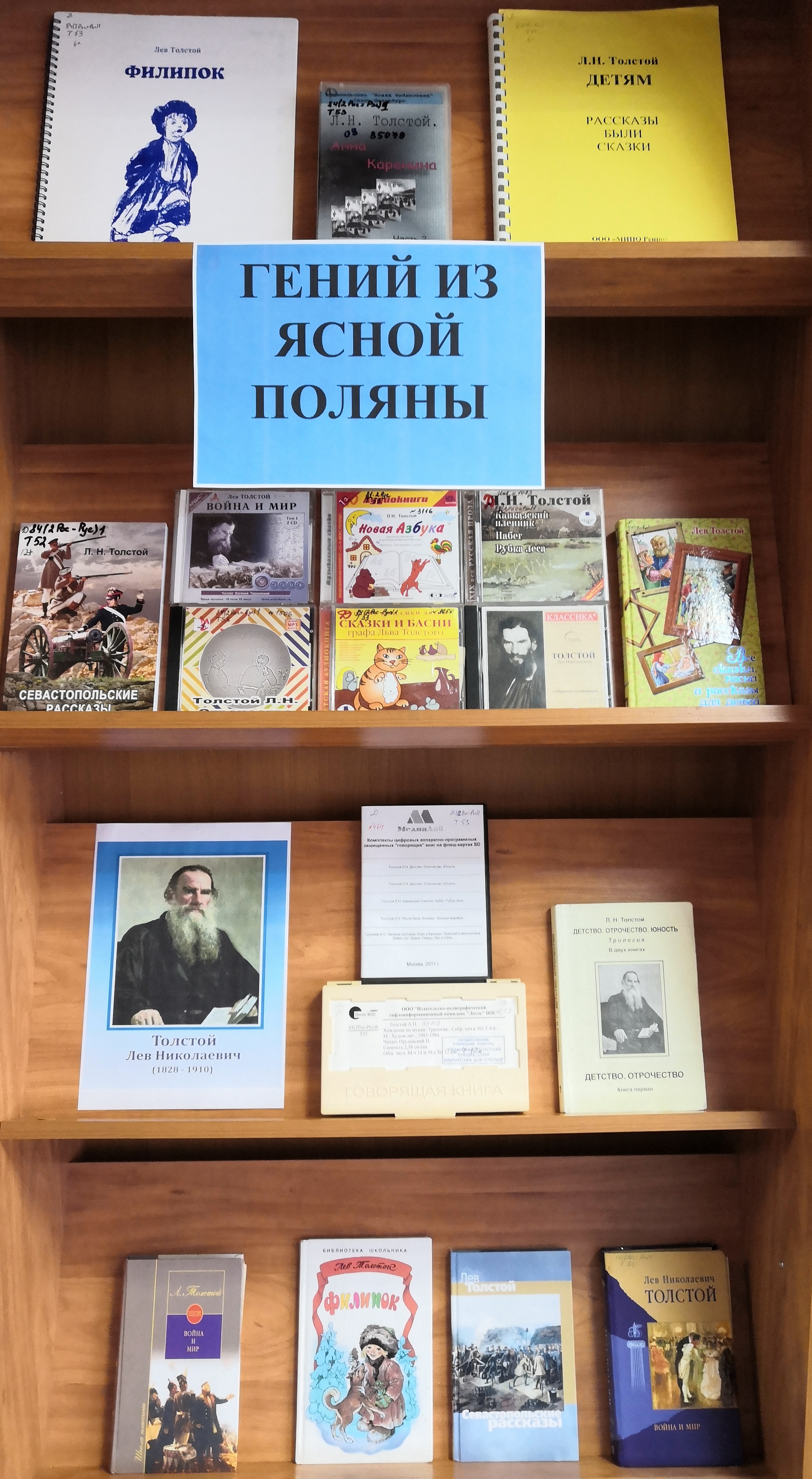 С 16 по 30 сентября 2023 год. Книжная выставка «Гений из Ясной Поляны», посвящённая 195-летию со дня рожденья Льва Николаевича Толстого