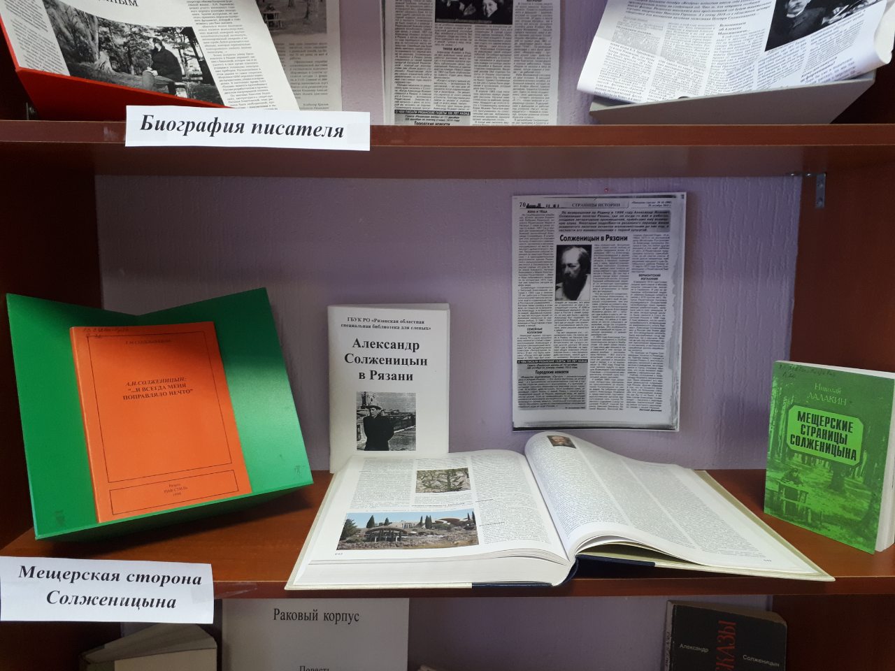 С 3 по 31 декабря 2018 года в читальном зале Рязанской областной специальной библиотеки для слепых будет работать краеведческая книжно-иллюстративная выставка «Солженицын и Рязанская земля» из цикла «Рязанское раздолье».