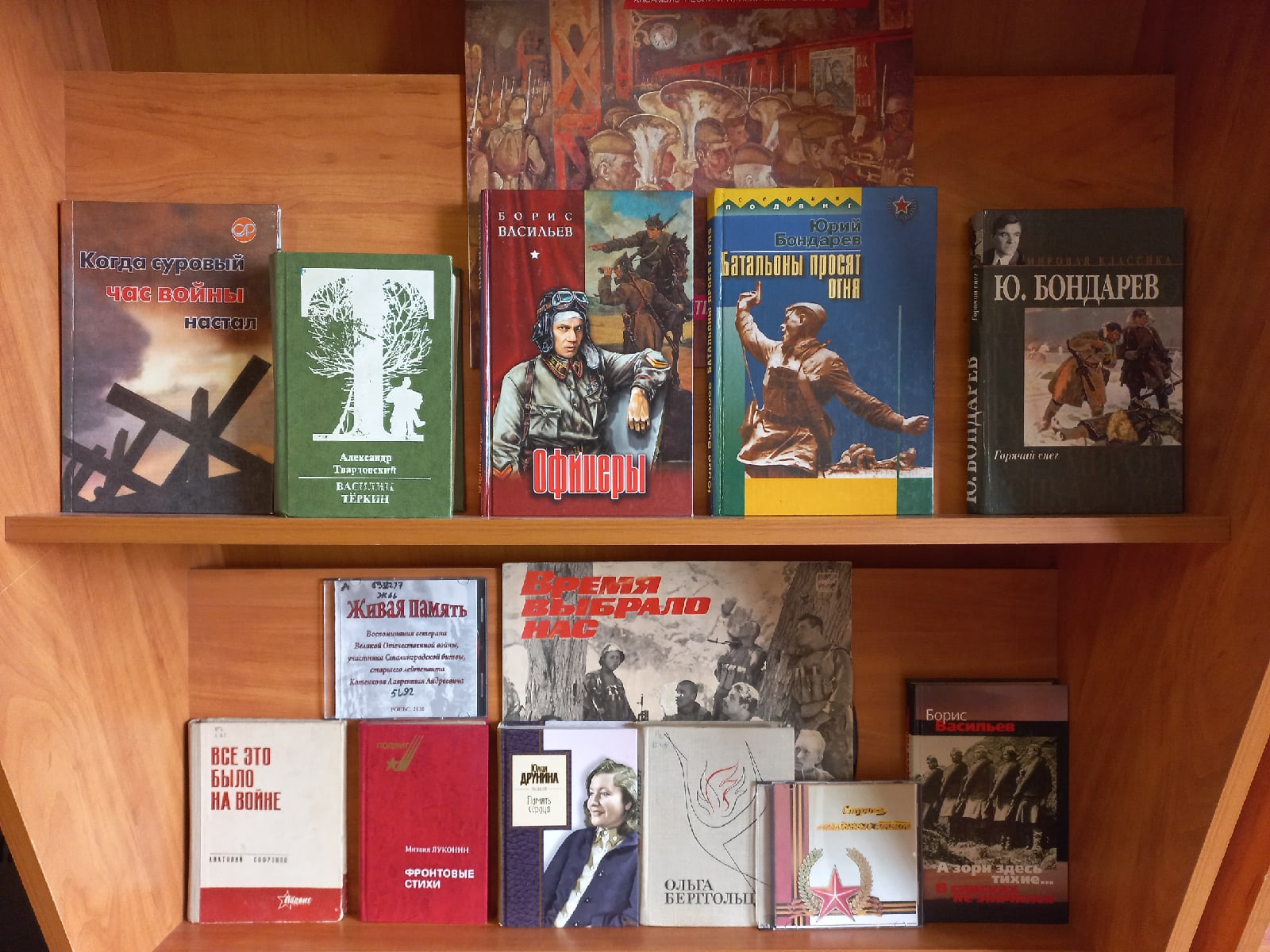 На книжной выставке представлены произведения, написанные как во время Великой Отечественной войны, так и спустя годы после её окончания.
