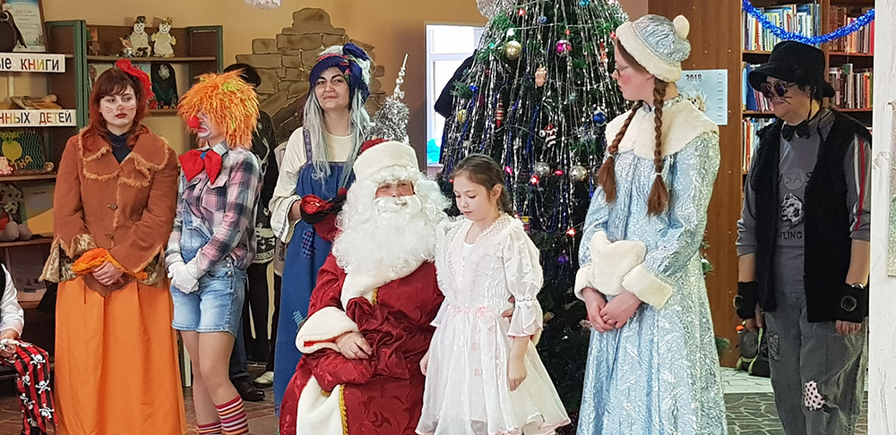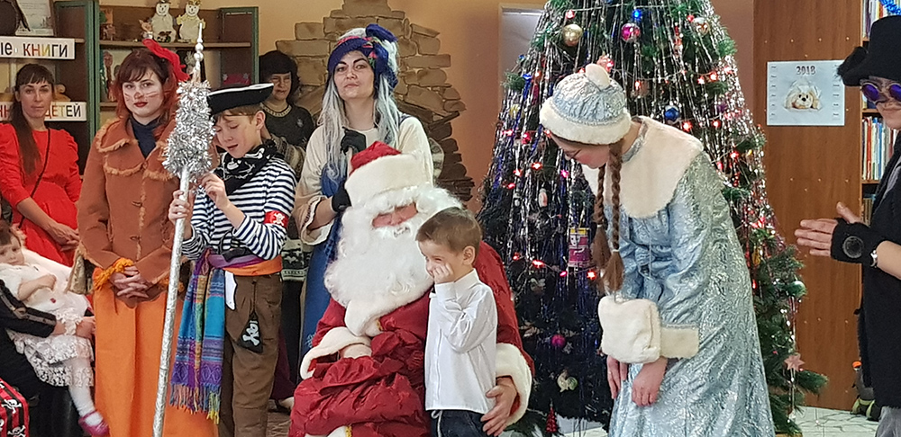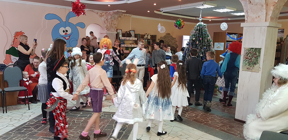 В начале мероприятия наших юных читателей и их родителей поздравила с наступающим праздником директор библиотеки Ольга Александровна Лунёва. Затем наша постоянная читательница Алёна Гриценко показала ребятам свою новую сказку для кукольного театра «По щучьему веленью». А потом Баба-Яга, клоуны, пират, лиса Алиса и кот Базилио увлекли ребят в настоящее сказочное новогоднее приключение. Девчонки и мальчишки преодолели все трудности и дождались Деда Мороза и Снегурочку. Дети водили хороводы, танцевали, угадывали мелодии, бегали в коробках, скакали на шарах, а потом устроили домашний концерт из заранее выученных стихов и песен. Затем на празднике появился символ наступающего года – весёлый поросёнок, сказочные герои поздравили ребят с Новым годом и вручили подарки.