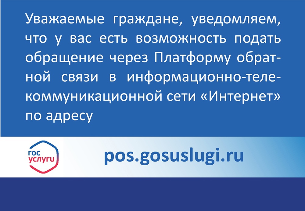 Уважаемые граждане, уведомляем, что у вас есть возможность подать обращение через Платформу обратной связи в информационно-телекоммуникационной сети "Интернет" по адресу pos.gosuslugi.ru.