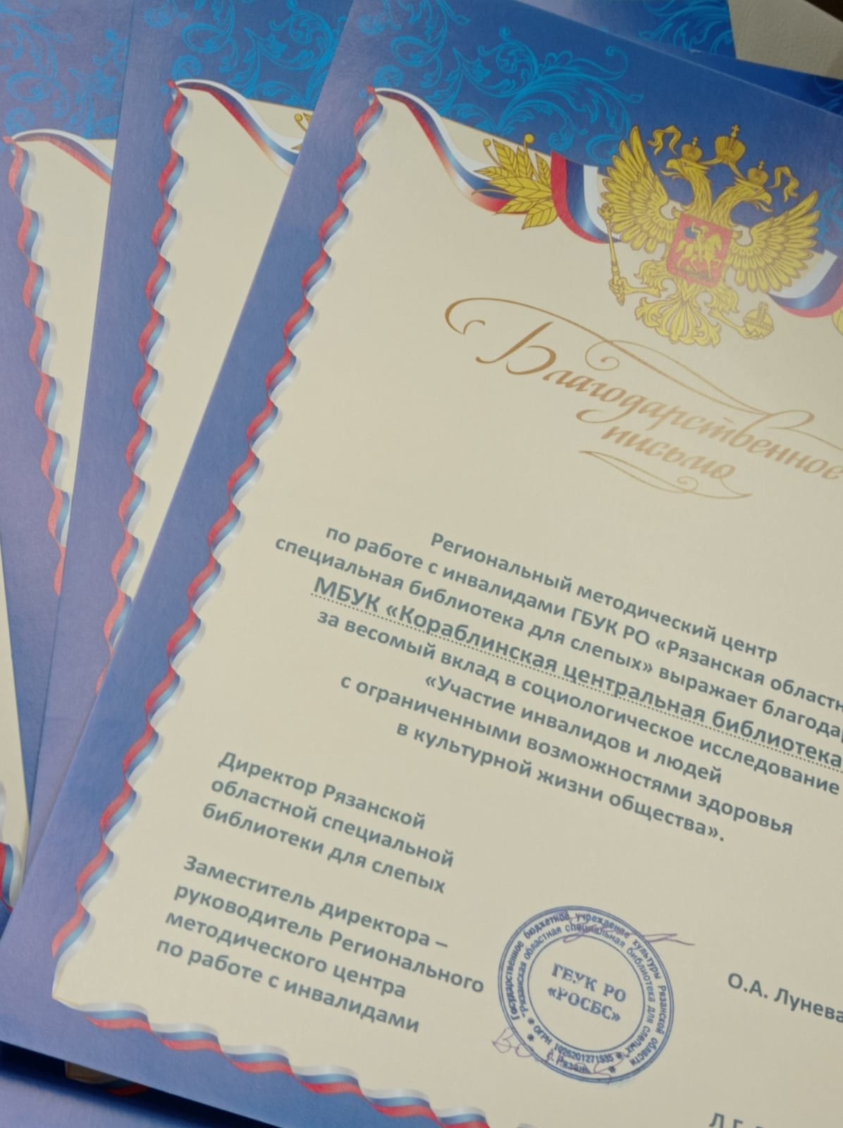 На совещании руководителей государственных, муниципальных, вузовских и школьных библиотек Рязанской области по планированию деятельности на 2025 г., состоявшемся 6 декабря 2024 года в Рязанской областной универсальной научной библиотеке имени Горького, директор Рязанской областной специальной библиотеки для слепых Ольга Александровна Лунёва и заместитель директора - руководитель Регионального методического центра по работе с инвалидами Лариса Георгиевна Волкова вручили благодарственные письма Ряжской центральной библиотеке имени И.И. Макарова, Центральной районной межпоселенческой библиотеке Касимовского муниципального района, Централизованной библиотечной системе города Рязани, Центральной библиотеке им. Л.А. Малюгина, Кораблинской центральной библиотеке за весомый вклад в социологическом исследовании «Участие инвалидов и людей с ограниченными возможностями здоровья в культурной жизни общества».