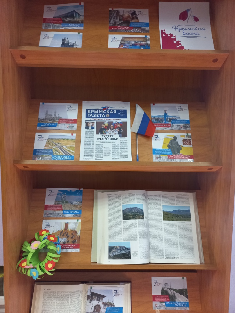 На выставке представлен материал с официального сайта «Крымская весна» (krvesna.rk.gov.ru), а также книги, рассказывающие об истории Крыма, и подборка материалов периодической печати под общим названием «Крым в истории России».