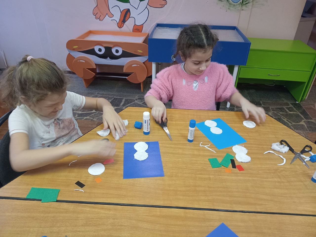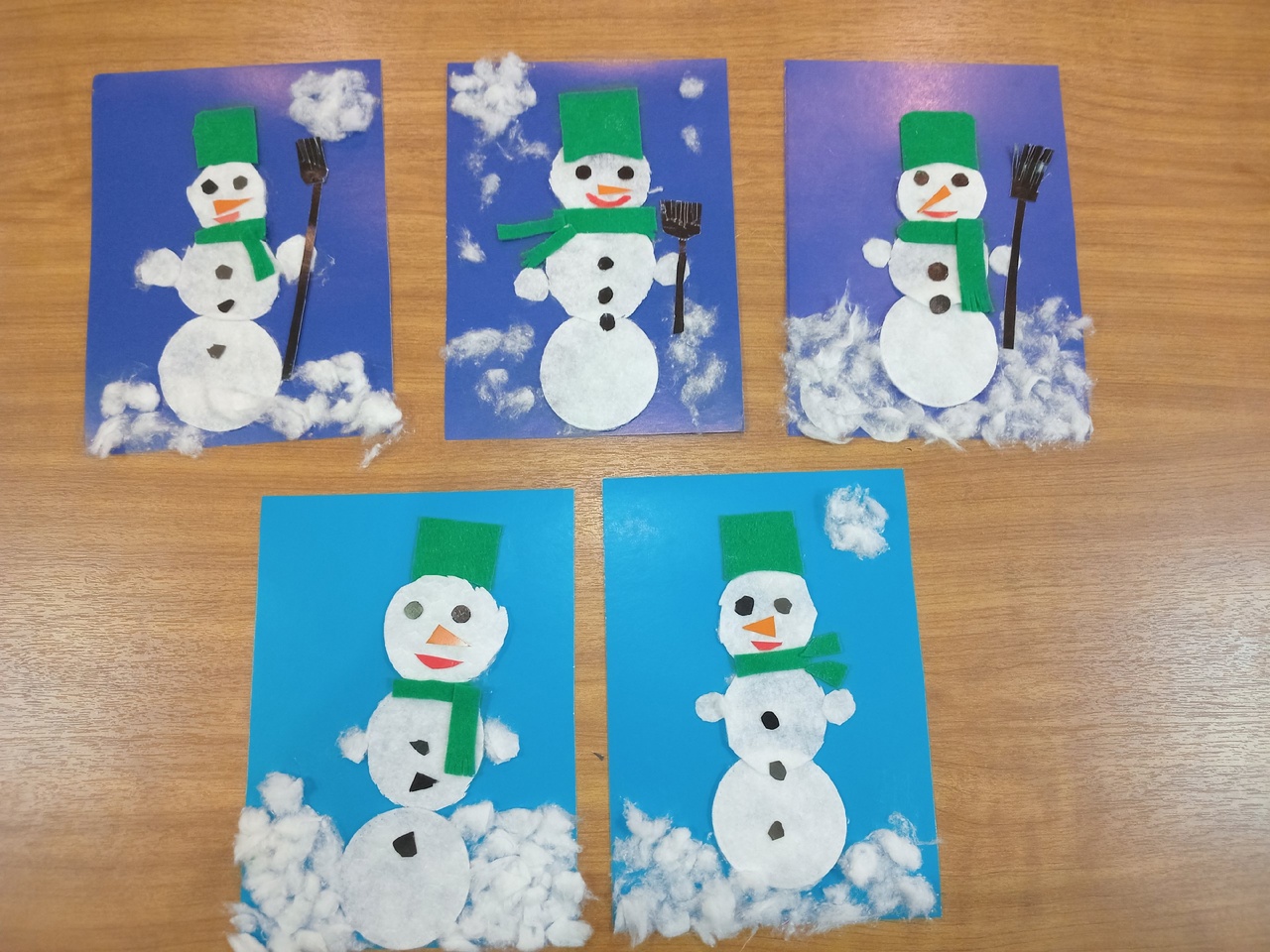 В этом году зима не балует нас снегом, вот ребята и попробовали сделать весёлых снеговиков из подручных материалов. Сначала педагоги побеседовали с детьми о том, какие бывают снеговики, потом ребята посоревновались в подборе эпитетов к слову «снеговик», а после этого под руководством педагогов сделали красивые аппликации снеговиков. Ловкие пальчики могут создать красивую поделку из чего угодно!
