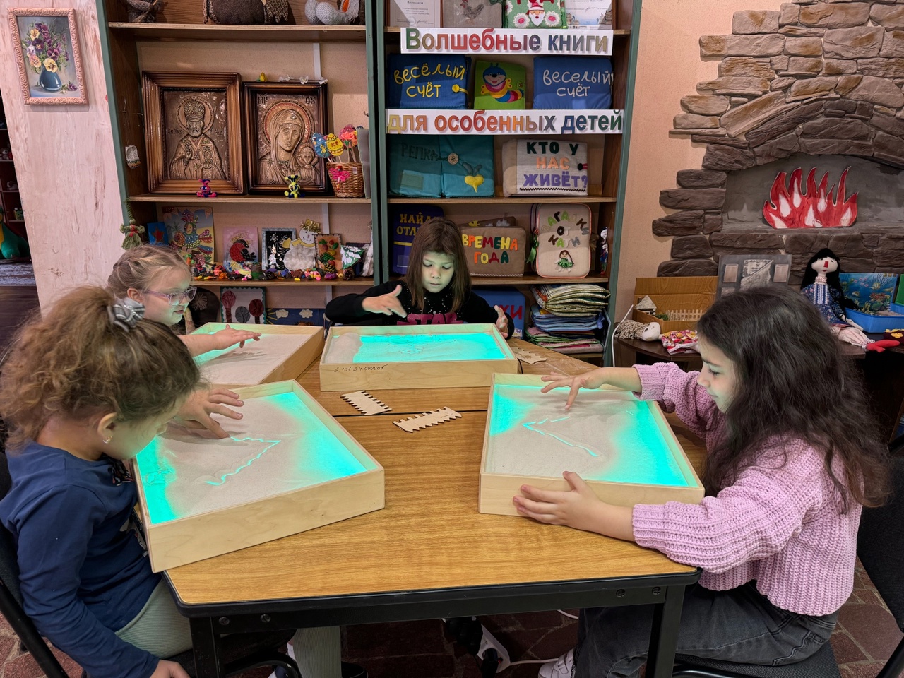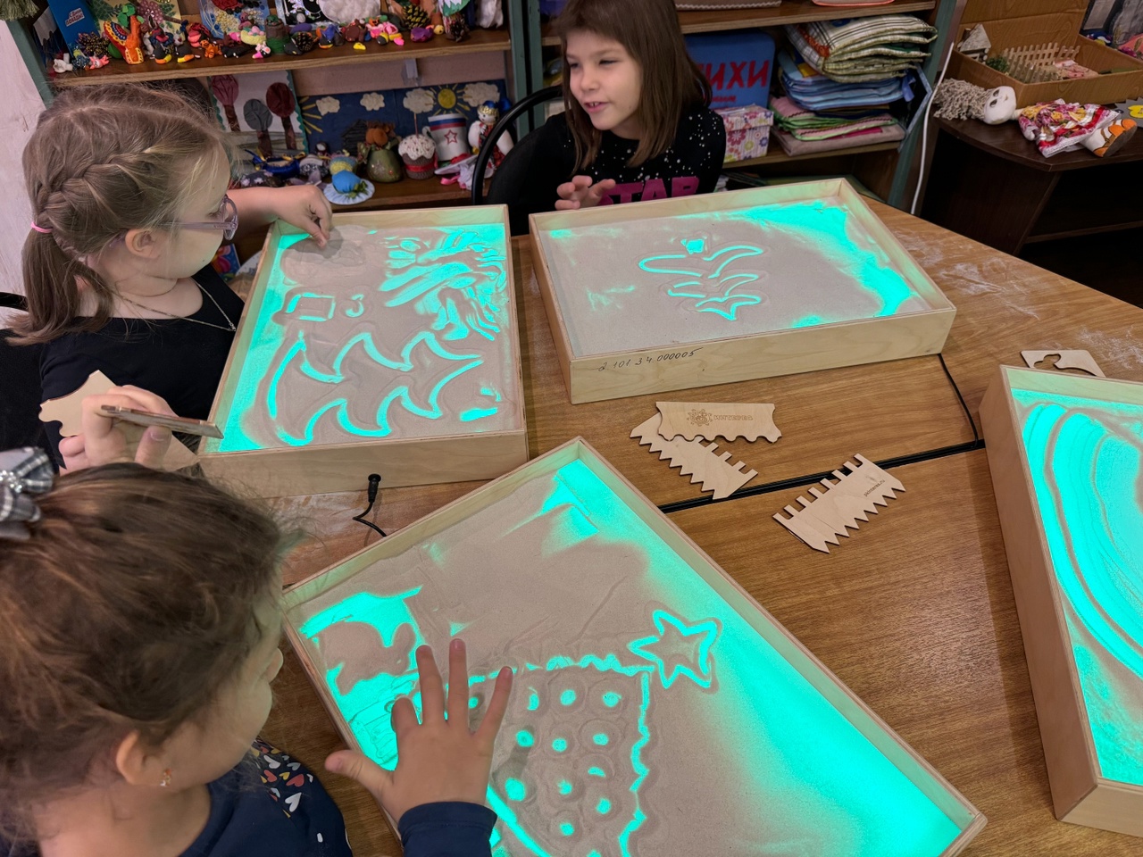 Потом ребята приступили к самому интересному – нарисовали на песочных планшетах ёлочку своей мечты. Совместное рисование на песочных планшетах, так же как и любая работа в команде, неизменно приносит нашим маленьким читателям большое удовольствие.
