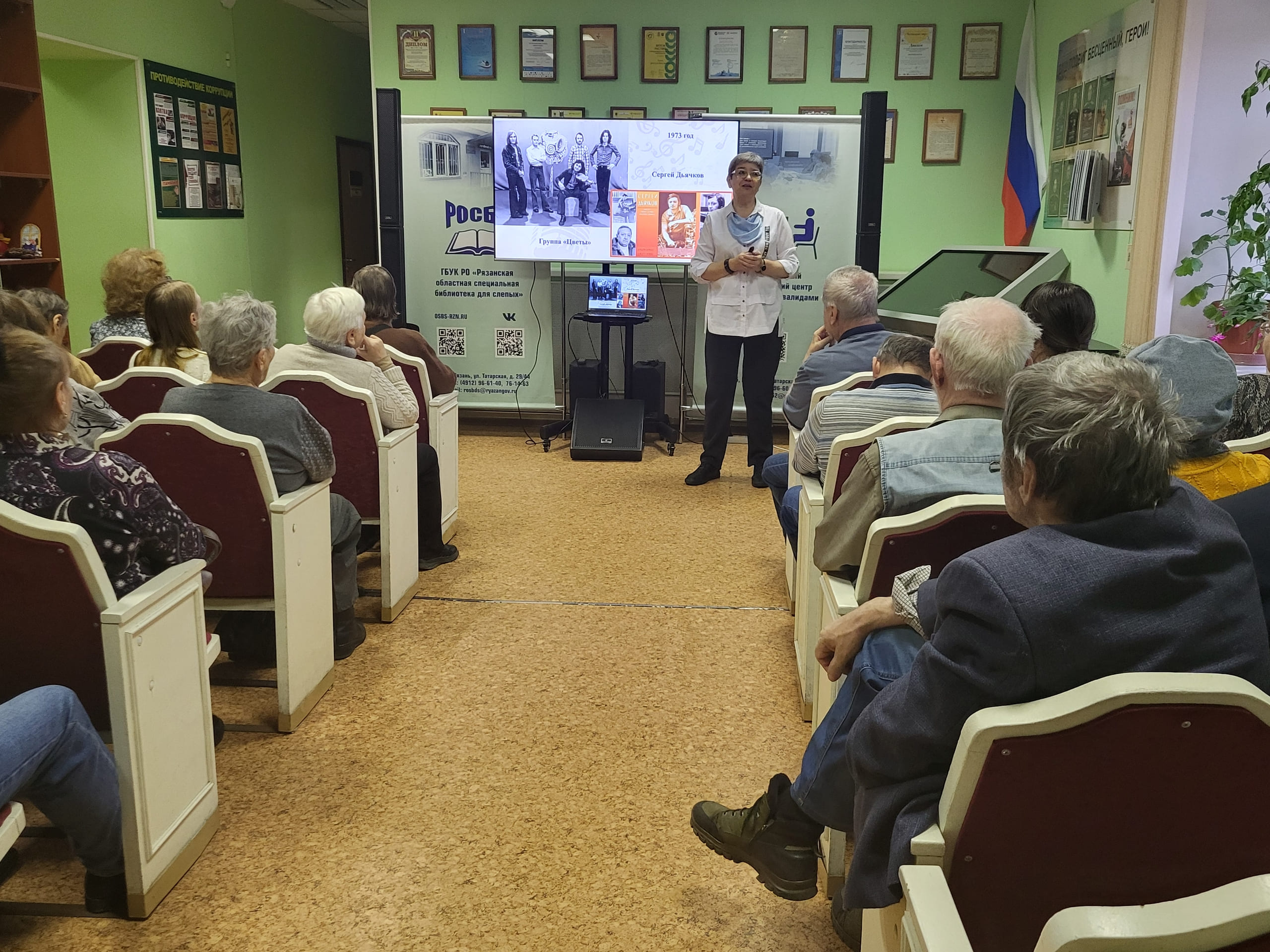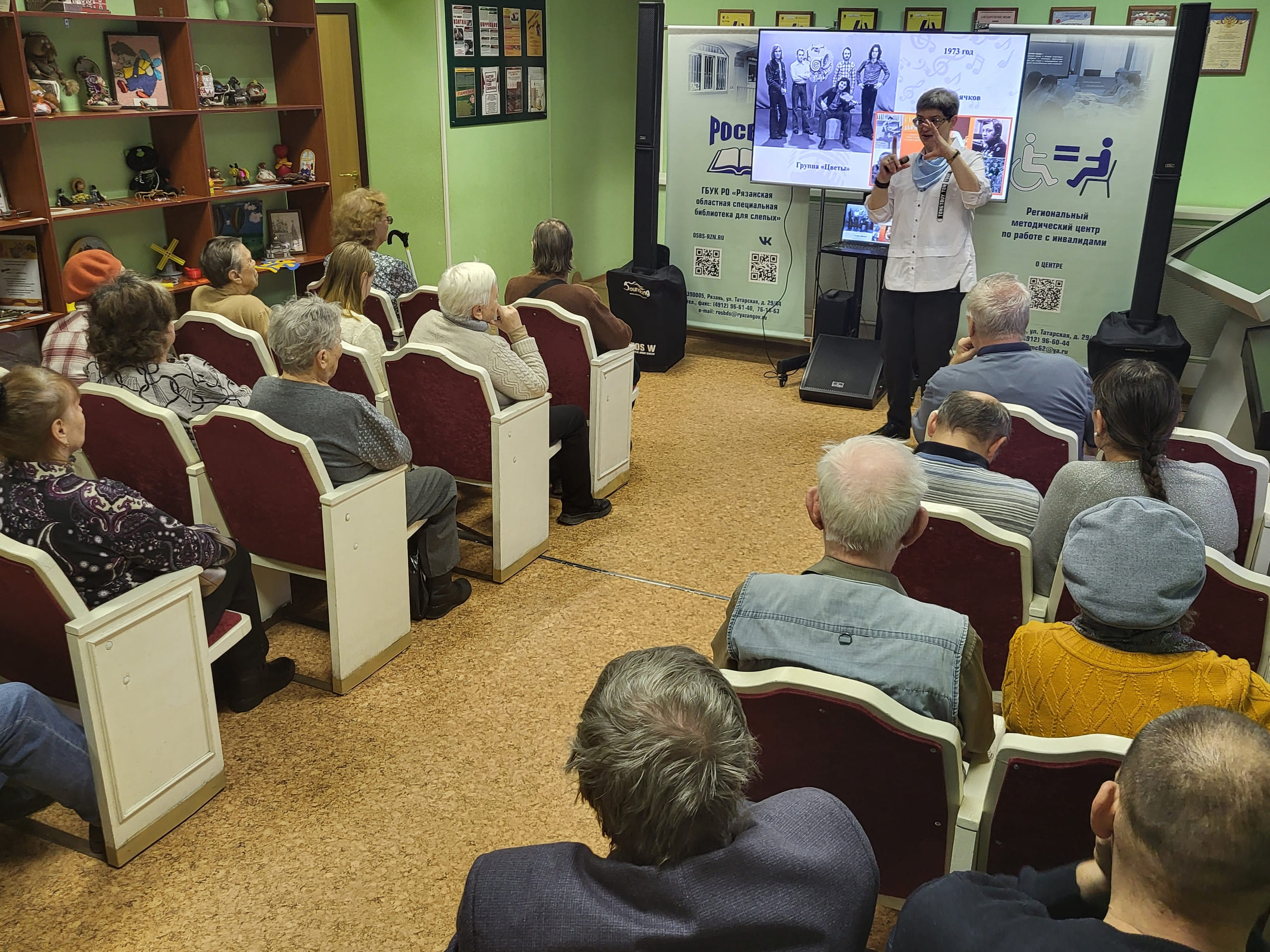 Мероприятие началось с одной из самых знаменитых и любимых песен группы «Цветы», «Честно говоря». Главный библиотекарь Регионального методического центра по работе с инвалидами Смирнова О.А. рассказала об ансамбле и истории создания песни.