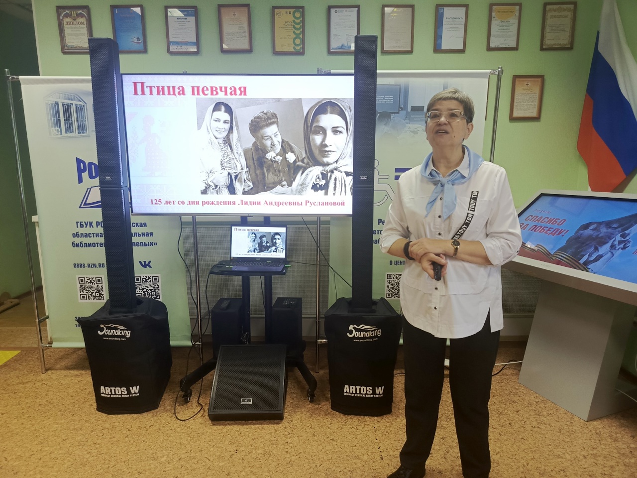 Вторая часть музыкального вечера была посвящена 125-летию со дня рождения лучшей исполнительницы народных песен Лидии Андреевны Руслановой. Читатели познакомились с биографией и творческим путём «Птицы певчей» из саратовской глубинки. Русланова прошла тяжёлый путь от нищенствующей сироты до всенародной любимицы. Гастроли по всей стране, концерты на фронте, роспись на стене Рейхстага, тюремное заключение в Озерлаге и Владимирском Централе, возвращение к зрителю – все эти этапы жизни артистки прошли перед слушателями.