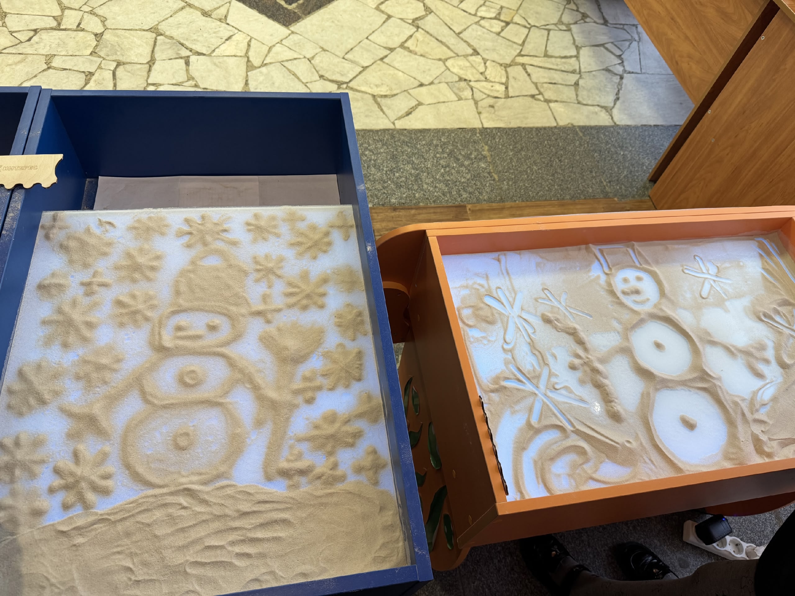 Дети погрузили пальчики в мягкий песок и почувствовали себя настоящими волшебниками. Под руководством педагога они нарисовали на светящихся планшетах симпатичного доброго снеговика в шарфике и с метлой, а над ним – звёзды в ночном небе. Каждый ребёнок придумал и рассказал друзьям свою маленькую зимнюю сказку.