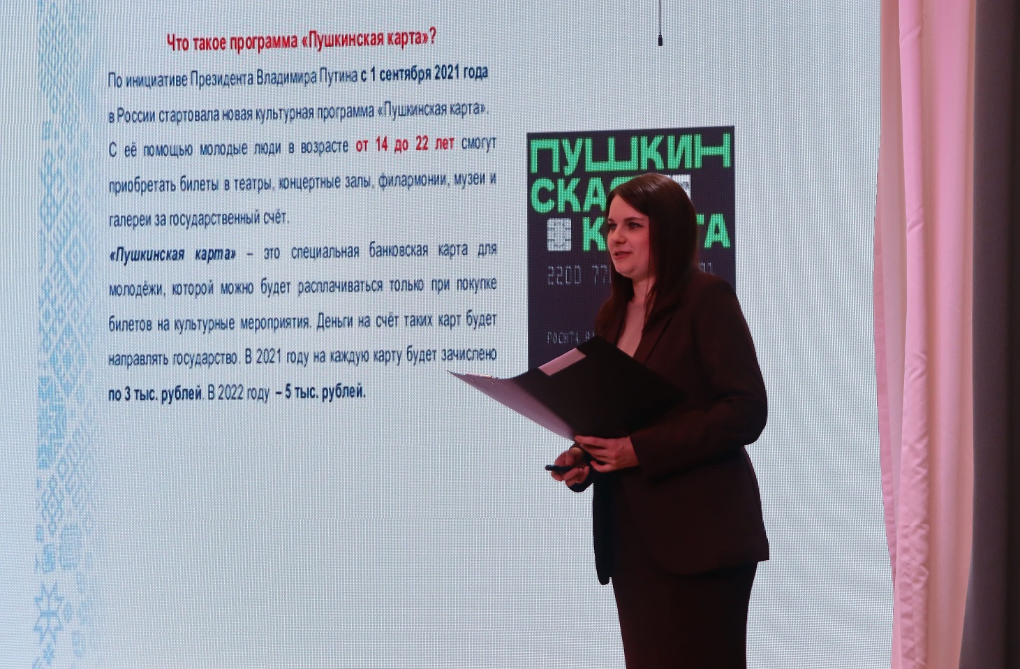 Школьникам и педагогам рассказали о возможностях Пушкинской карты, предназначенной для молодёжи в возрасте от 14 до 22 лет, позволяющей посещать театры, музеи, выставки, кинотеатры и филармонии, участвующие в государственной программе поддержки культуры. Участники получили подробную консультацию о порядке оформления карты, размере выделенных денежных средств, правилах приобретения билетов и мерах защиты от мошенничества. По завершении мероприятия библиотекари провели разъяснительную работу среди педагогов, раздали классным руководителям информационные буклеты и ответили на возникшие вопросы.