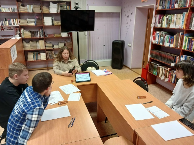 В читальном зале царила атмосфера напряжения и сосредоточенности, школьники активно обсуждали версии, стремясь к победе.