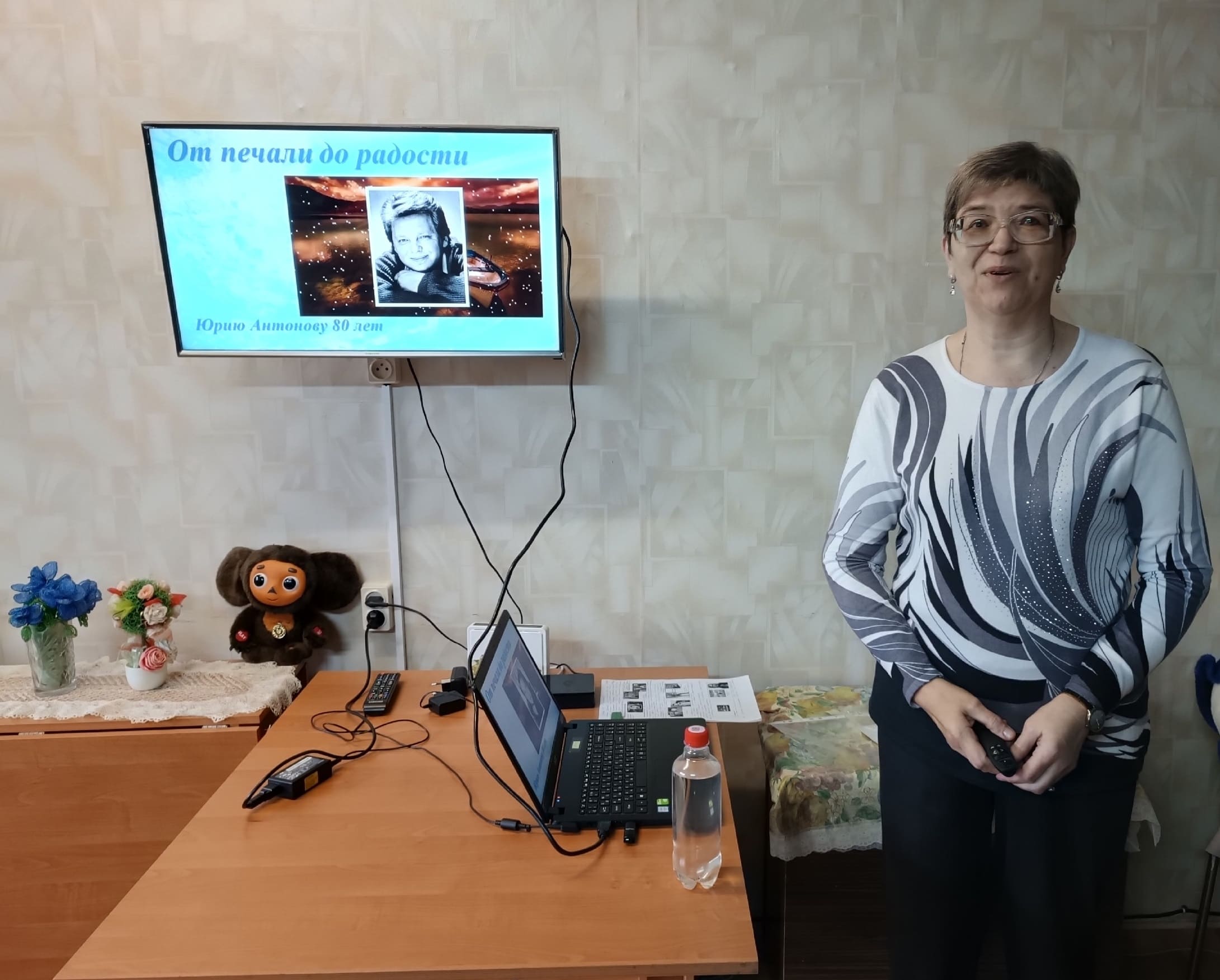 Главный библиотекарь Регионального методического центра по работе с инвалидами Смирнова О.А. рассказала о нелёгком творческом пути Юрия Михайловича, когда ему приходилось, несмотря на популярность, пробиваться сквозь партийные кабинеты, чтобы выпустить диск-гигант, о затирании его на телевидении и т.д. Особый интерес у читателей вызвал материал о истории создания самых популярных песен: «Нет тебя прекрасней», «Красные маки» и других. Читатели с удовольствием подпевали знакомым и любимым произведениям Антонова.