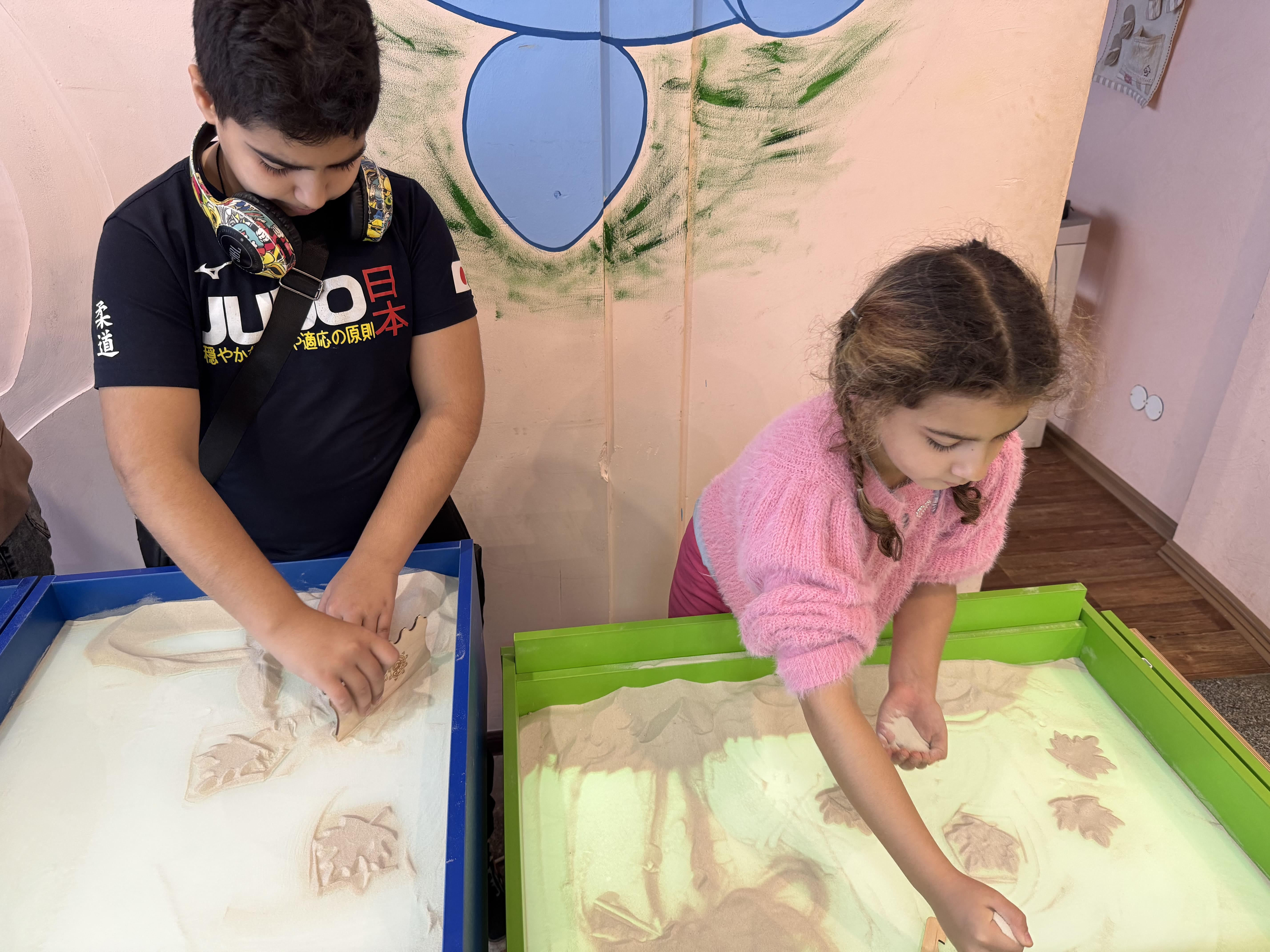 Занятие началось с чтения стихов Сергея Александровича Есенина, 130-летие которого мы праздновали накануне. Поэт любил время золотого листопада и посвятил осени прекрасные стихи. Песни «Клён ты мой опавший…» и «Отговорила роща золотая…» стали поистине народными. Ребята побеседовали о том, какие листья мы можем увидеть золотой осенью, а затем приступили к рисованию листьев на песочных планшетах. Пескотерапия – особый вид изобразительного искусства, который очень нравится детям, потому что помогает расслабиться и снизить эмоциональное напряжение, а также позволяет воплотить в жизнь самые смелые фантазии.
